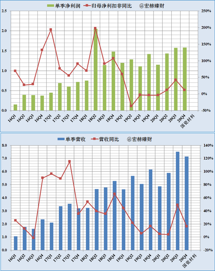 从历史上来看,公司营收整体上维持逐年上升的趋势,由于业务并不仅局限在MLCC材料,因此公司业绩并没有随着半导体行业的周期性而波动,而是在不断并购的支持下维持了较高的增速,2015-2019年营收复合增速高达41.8%。在疫情黑天鹅冲击下,2020年比上年同期增长18.08%。