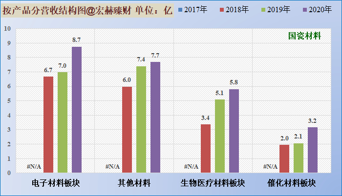 分业务来看,2020年公司四大业务的营收占比分别为:电子材料34.4%,生物医疗材料22.9%,催化材料12.4%, 其他材料30.3%。