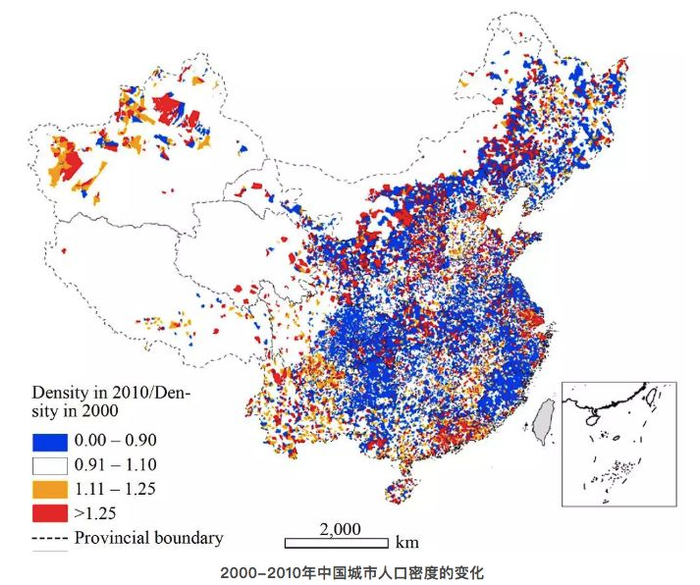 2000-2010年,中国650多个行政城市中,180个城市的人口是减少的态势。在城市密度图中,可以看到将近1/3国土面积的人口在变少。而从街道格局而言,900多个街道办事处人口都在变少。