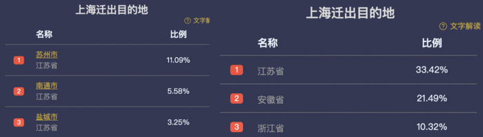 2月10日是假期开始的前一天,通过百度提供的迁徙大数据,我们看到了今年上海的热门迁出人口主要目的地,以城市级别来看,前三是苏州、南通、盐城。以省份级别来看,则是江苏、安徽、浙江。