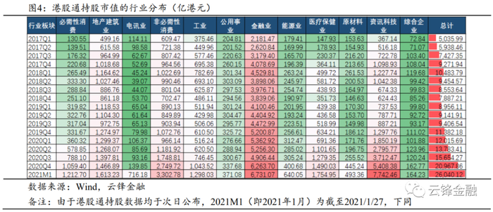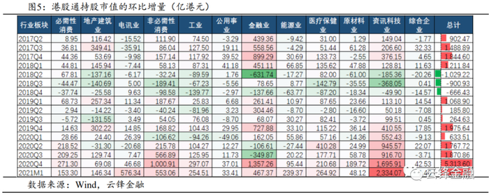 2020Q4与2021年1月,港股通持股增量市值分别为5313.60亿港元、5,072.26亿港元,均创历史新高。2021年1月,南向资金增配最多的行业主要为资讯科技业、电讯业、非必需性消费,分别增配2,334.07亿港元、576.34亿港元、553.06亿港元。