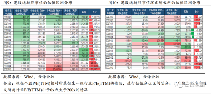 2020Q4启动的本轮南向资金大举流入港股,更多是A股流动性溢出与港股风险偏好改善驱动,并且南向增量资金在结构上存在分化,资金在增配板块上存在分层。资金的来源决定投资的风格,以保险为代表的配置型资金,注重资产负债的匹配,更倾向于配置金融等低估值高股息的价值型标的;而以公募基金为代表的交易型资金,则注重创造超额收益,虽可能会以低估值高股息标的作为底仓配置,但更多Alpha收益的创造则需精选资讯科技等成长性标的。从南向资金增配港股板块的情况来看,大概率是保险等配置型资金主要加仓金融业、电讯业等低估值高股息板块,而公募基金等交易型资金则更多增配资讯科技业、非必需性消费业等成长性板块。