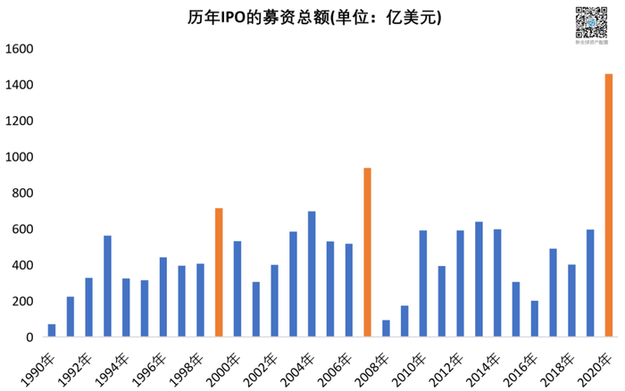 如果说2020年的股市行情先抑后扬,收官疯狂的话,那么2020年IPO打新这个市场,可谓全年火爆,成为许多投资者争先恐后参与的香饽饽。A股打新几乎“稳赚不赔”的买卖就不赘言了,我们纵观美国香港等发达市场,2020年的新股IPO也是一枝独秀。以美国为例,全年IPO共发行387家,累积募资1457亿美元,不仅远超99年和07年,更创下了单年历史最高的募资额。