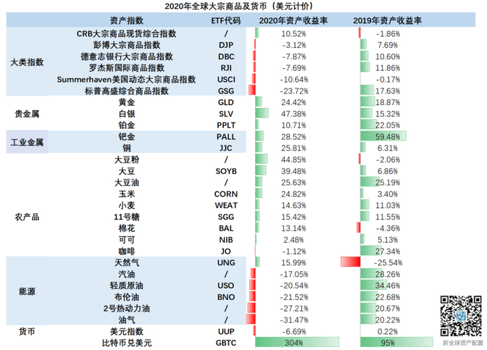 其中,白银涨幅最高达47.38%,其次是大豆,涨幅逾30%,形成鲜明对比的是,2020年是油类的至暗时刻,我们的大类资产表显示,油类大宗商品几乎清一色跌超20%。值得一提的是,备受争议的比特币,2020年大涨304%,我们也将其数据加入了下表中。下面,我们从大宗商品的细分项,来看看2020年商品的浮浮沉沉。