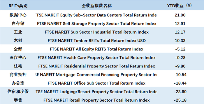 不过,虽然REITs板块整体表现不佳,但是一些细分行业的REITs还是跑赢大盘的。根据拥有并经营的房地产类型不同,REITs可以分为这些类型:零售、住宅、基础设施、医疗保健、办公室、工业、数据中心、自存储、住宿、林地子类,疫情对这些子类的影响程度不一。