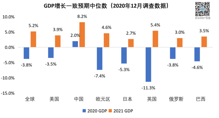 各大机构对全球GDP2021年的增速一致预期为5.2%,可完全修复2020年-3.8%的下滑。而且根据这个预期,中美两国都能实现今明两年经济正增长。