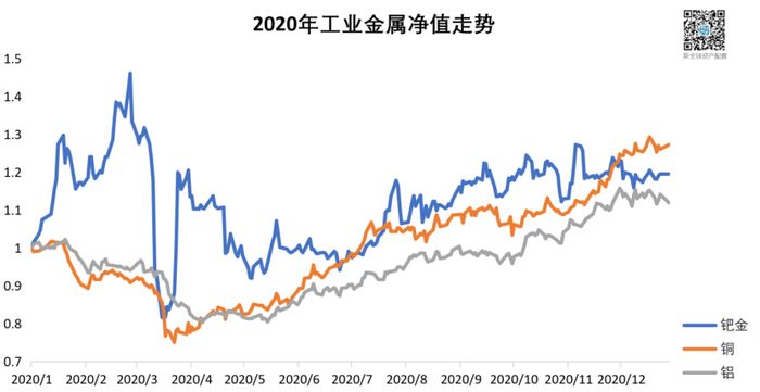 工业金属方面,作为汽车尾气催化剂重要成份的钯金,由于去年的汽车尾气排放要求的不断提高,钯金价格已经快速上涨到过高的位置,迫使产业部分使用有相对性价比的铂金,这使得钯金2020年价格处于震荡上升的情况,2020年钯金涨幅28.52%,大幅低于去年的59.48%。其他大部分工业金属,在疫情爆发超跌之后,随着经济的复苏,价格都开始稳步攀升。另外,由于全球各国对于绿色能源经济的推动,刺激了这些工业金属新的需求增长点,促使它们价格持续上升。