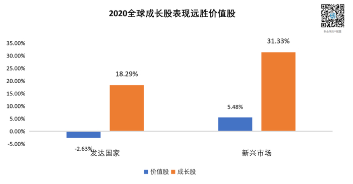 不仅如此,为了应对疫情冲击,美联储在内的各国央行,均采取了很大程度甚至无限制的货币宽松政策,直接刺激了全球范围内成长股的继续向上攀高,成长和价值的差距愈发明显。无论从发达国家还是新兴市场来看,2020年成长股的表现,都完胜其对应的价值股。