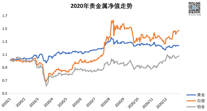 2020年贵金属全体收涨,其中白银涨幅达47.38%,黄金达24.42%。但其中起落也有不同阶段,值得我们考究。一季度,由于担心新冠疫情导致经济衰退,以及美联储大水漫灌带来的通胀预期,黄金白银作为有避险属性的实物资产受到了追捧,快速上涨。然而当疫苗研究取得突破等各项捷报频出之后,作为避险资产的它们,在四季度又被无情地抛弃,价格快速回调。