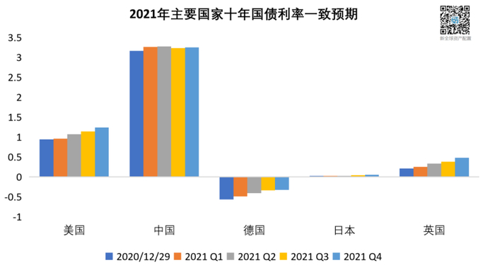 在乐观的经济复苏情绪下,市场预期全球主要国家国债利率在2021年基本呈上行走势。只有中国十年国债,由于仍有3%以上的利率,市场预期利率走势基本走平。