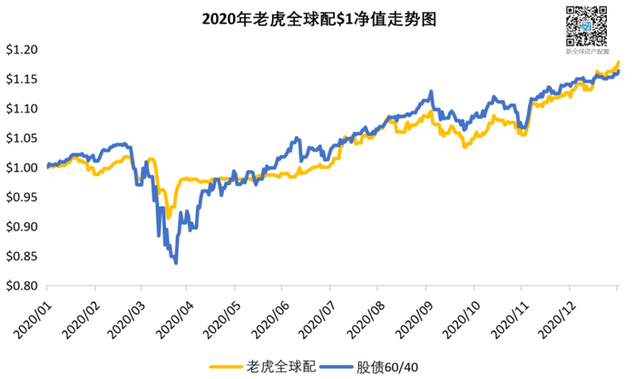 从下面2020年的老虎全球配策略的净值走势图中可以明显看出,相比基准组合,策略总体走势平缓,尤其是疫情黑天鹅的三月份,通过科学的风控策略有效控制回撤,规避权益资产大跌的风险,最终实现比基准组合更低的波动和回撤。