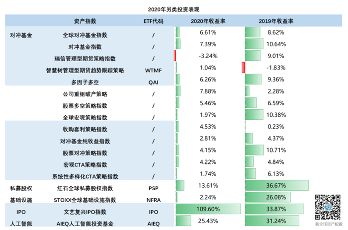 另类投资包括了各种主动的对冲基金策略,值得注意的是,2020年文艺复兴,Two Sigma和桥水等知名对冲基金却折戟沉沙,收益远远低于股票和债券。在我们覆盖的17个另类投资指数中,回报中位数约4.5%,低于去年的7.60%,只有瑞信管理型期货策略指数录得负收益。而文艺复兴IPO指数表现极其显眼,今年取得了翻倍的收益。