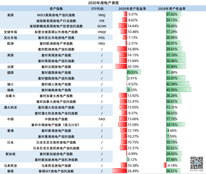 受疫情的影响,2020年房地产没有延续2019年的优秀表现,除了少数国家如德国、瑞典取得正收益外,其余均收跌,泰国SET房地产信托指数更是下跌了26.49%。