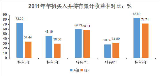 可以看出:持有5年,两者收益差距还很明显;持有7年,差距微乎其微;持有8年“差等生”竟然反超!而且随着持有时间的拉长,B组与A组收益率差距整体呈现出缩小的趋势。