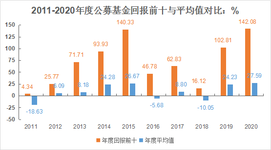 (数据来源:Wind;统计区间:2011-2020年;统计范围为A股全市场非货币公募基金,回报数据为算术平均值)