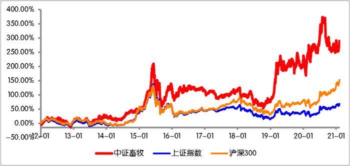自指数基日2011年12月31日至今,中证畜牧养殖指数长期业绩突出,并持续大幅跑赢农业指数以及沪深300指数上证指数等A股核心指数。