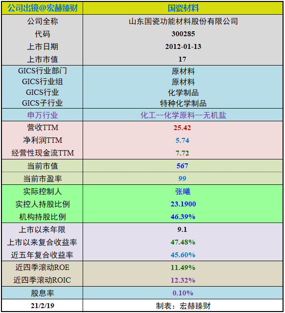 国瓷材料自上市以来9.1年,年均复合收益率为约47.48%。截止当前评测日近五年年均复合收益率为45.60%。