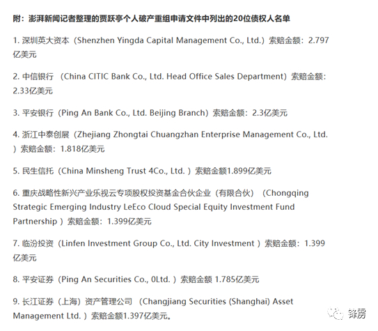 据澎湃新闻统计,在贾跃亭的债务名单中,临汾投资的索赔金额为1.399亿美元,按照2019年12月31日汇率折合人民近10亿元,在一众债权人中排名第7。