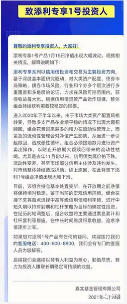 1月16日,添利专享1号在官方声明中对产品净值下跌做出回应表示,“由于市场大类资产配置风格转变,导致多只产品在业绩平稳的情况下出现大面积赎回,组合花费越来越多的精力在流动性管理上。而紧急的流动性管理会对净值产生影响,从而进一步引起赎回,造成恶性循环。组合必须提前数月进行资产卖出操作,以防止开放期大额赎回带来的流动性枯竭。”