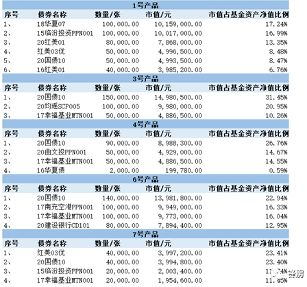 具体明细如下,添利专享1号持有华夏幸福所发售的18华夏07债券,市值占基金资产净值比例的17.24%;添利专享3号持有华夏幸福所发售的17幸福基业MTN001,市值占基金资产净值比例的10.26%;添利专享4号持有华夏幸福所发售的17幸福基业MTN001及16华夏债,市值占基金资产净值比例的15.14%;添利专享6号持有华夏幸福发售的17华夏基业MTN001,市值占基金资产净值比例的16.04%;添利专享7号持有华夏幸福所发售的17幸福基业MTN001,市值占基金资产净值比例的11.45%。