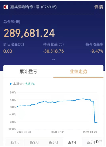 近日,多位投资人向锋雳爆料,支付宝平台此前推出高端理财平台尊享,第一个上新的投资项目是嘉实基金旗下的嘉实添利1号,利率为5%的中低风险。这是一款31万起投的产品,每期200人上限,运作一年来走势极差,2021年初临近赎回期,突然大幅暴跌。