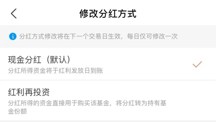 要提醒大家的是,在很多平台,红利再投资的分红方式不是默认的方式。如果想要采用红利再投资的方式,需要投资者主动选择。大家可以打开自己的持仓,找到“修改分红方式”,将“现金分红(默认)”改选为“红利再投资”。