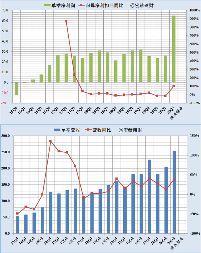 公司整体净利润较为波动,2020年三季度,陕西煤业公司实现归母净利润为114.79亿元,同比大增26.73%。主要原因为公司从7月开始因朱雀信托到期清算,减持间接持有的隆基股份1.39亿股,同时通过朱雀基金减持赣锋锂业H股股份876.32万股,导致三季度公司实现投资收益50.71亿元,从而使公司业绩超预期。