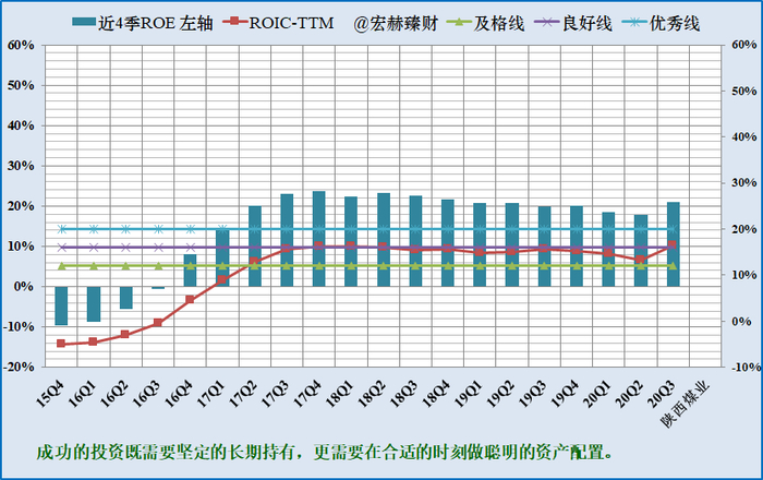 陕西煤业公司ROE从2017年开始一直保持在优秀线(20%)以上,ROIC盈利指标处于良好线上下浮动,未来一直预期ROE在良好线上。