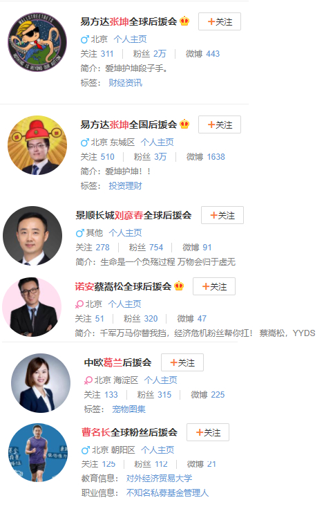 在微博上搜索时下较热的基金经理,就会弹出相应的后援会,其中张坤粉丝最多,曹名长经理虽然过去一年业绩不是很突出,但在年后整体基金都下跌的情况下,由于其管理的基金还是呈平稳状态而赢得了一波热度。
