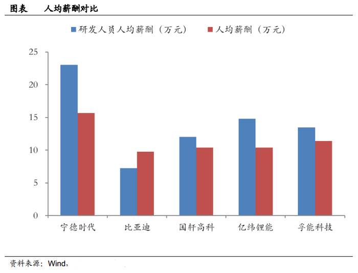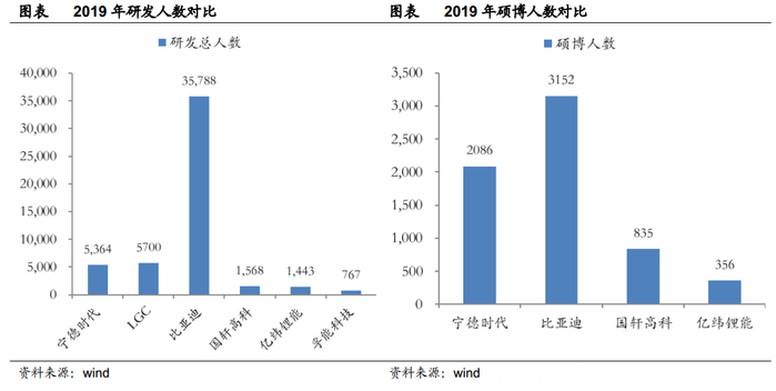 公司拥有超五千人的动力电池研发团队,硕博人数逾 2000。公司2019年年报中披露的研发人员总数为5364 人,远高于国轩高科、亿纬锂能、孚能科技等国内厂家。LGC的研发人员数为 5700 人,但考虑到 LGC 中电池业务的营收和资产比重均 小于 40%,预计动力电池部门的研发人数将显著少于宁德时代。比亚迪 2019 年年 报中披露的总研发人数为 35788,其中电池部门的研发人员大概在四千多。综合来 看,公司拥有最庞大的动力电池研发团队。从硕博人数上看,公司硕博人数超 2000人,略少于比亚迪的三千多人,远高于其他公司。