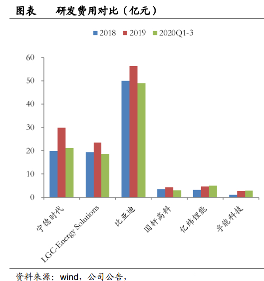 公司研发费用位于行业前列,持续高研发投入保障研发实力。公司2019年研发费用为 29.9 亿,高于 LGC电池部门的23.5 亿,仅次于比亚迪的56.3亿。但比亚迪为整车制造商,其研发团队包括除了电池外的诸多部门。从研发费用率上来看,公司2018-2020年研发费用率保持在6.5-7%之间,显著高于比亚迪和LGC电池部门。综合来看,公司研发投入位于行业前列,高研发投入能够保障公司的研发实力。