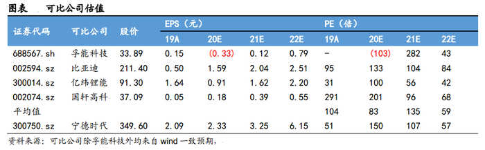 我们选取了锂电行业的几家主流公司和公司作为对比,20/21/22 年平均PE为 83/135/59 倍。公司作为全球动力电池龙头企业,技术和成本优势显著,盈利能力领先,预计20/21/22年EPS为2.33/3.25/6.15元,20/21/22年对应P/E 为150/107/57。考虑到新能源车及储能行业的发展前景和公司作为全球龙头的领先优势,建议投资者持续关注。