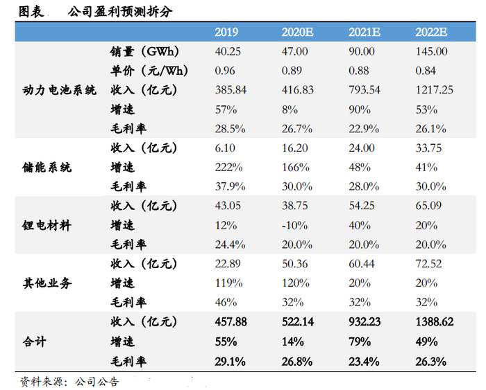 我们预计公司 2020/2021/2022 年动力电池系统销量分别为 47/90/145GWh,对应单价分别0.89/0.88/0.84元/Wh,毛利率为26.7%/22.9%/26.1%。