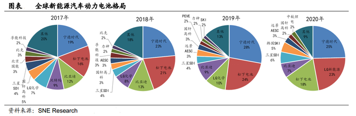 公司为全球动力电池龙头企业,2017 年起市占率保持全球第一。从2018年开始全球动力电池出货量前四基本稳定,为宁德时代、LG化学、松下和比亚迪;宁德时代在2017-2019年均为全球第一。2020H1由于国内装机量受疫情影响下滑导致暂时落后于 LG 化学,随着国内装机恢复和公司海外客户开始放量,2020年全年宁德时代的电池装机量达到 34GWh,对应25%的市占率,仍居全球第一。