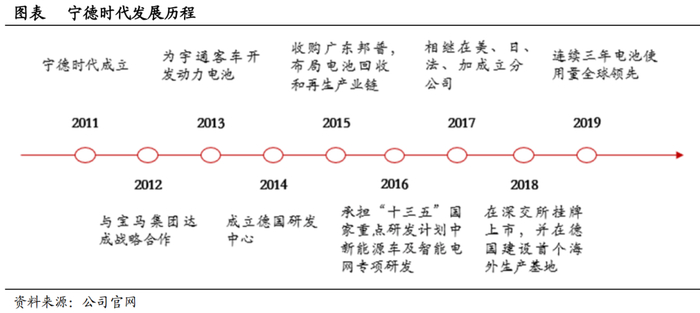 2011年,曾毓群先生二度创业,与 ATL 研发副总黄世霖共同成立宁德时代。2012年,宁德时代技术团队成功攻克800多页的宝马生产标准文件,满足宝马所有技术要求,成为其核心供应商,为宝马首款纯电动车“之诺1E”生产动力电池。此后,作为国内首先打入海外龙头车企供应链体系的动力电池厂商,宁德时代先后与奔驰、大众等全球名企建立合作,并成为北汽新能源、长城、上汽、长安等国内车企巨头的动力电池供应商。2017年,公司动力电池销量超过松下,首次成为动力电池行业龙头,并将龙头地位一直保持。