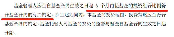 小欧再拿偏股混合型基金举个例子,招募说明书内通常会约定这类基金的股票仓位为60%—95%,而在成立后的6个月建仓期内,基金仓位可以不用立即符合该规定: