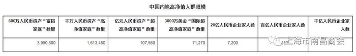 除港澳台之外,中国内地拥有600万人民币资产的“富裕家庭”数量已经达到399万户,比上年增加6.8万户,增长率为1.7%,其中拥有600万人民币可投资资产的“富裕家庭”数量达到144万户;拥有千万人民币资产的“高净值家庭”数量达到161万户,比上年增加3.7万户,增加2.4%,其中拥有千万人民币可投资资产的“高净值家庭”数量达到87万户;拥有亿元人民币资产的“超高净值家庭”数量达到10.7万户,比上年增加2.760户,增加2.6%,其中拥有亿元人民币可投资资产的“超高净值家庭”数量达到6.4万户;拥有3000万美金的“国际超高净值家庭”数量达到7.1万户,比上年增加1.960户,增加2.8%,其中拥有3000万美金可投资资产的“国际超高净值家庭”数量达到4.6万户。
