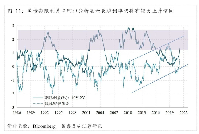 首先,可以参考历史期限利差变化形态和美债长期走势中枢。历史上10Y-2Y期限利差的变化特征显示,假如两年期利率保持不变,则10年期利率还有130bp的上升空间,即可以达到2.8%,但是后半程的上涨速度要慢于前半程。从1976-2021年的线性回归拟合残差看,自2008年末QE以来,残差中枢出现了较为明显的上升趋势。我们认为,随着本轮无限量QE操作,这种趋势将可以保持,未来利率还有170bp才能达到该向上区域的上沿。