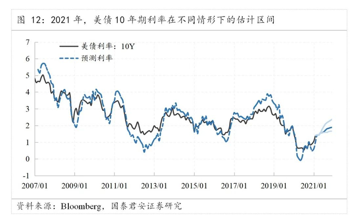 其次,我们通过构建预测模型进行分析。我们认为,影响美债的因素主要包括大宗商品价格的输入性通胀、通胀预期、海外资金和联储购债节奏四大因素影响。因此,我们通过使用布伦特油价、PCE、德债利率和联储资产负债表季度变化四个因素以及美债自相关特性,通过构建ARIMAX(1,1,0)模型进行预测。在乐观情形下,受到内部需求和外部输入性通胀的压力,美债利率或将在2季度末站上1.75%并于年末达到2.38%;在中性情形下,美债利率可于年末达到1.89%;在悲观情形下,美债利率可于年末达到1.67%。值得一提的是,对于悲观情形是按照通胀PCE上升0.1个百分点、油价增长6%、欧洲复苏不利以及联储增加QE计划的条件下预测的。因此,我们认为基准情形下,美债在2021年或仍然将有至少30bp的上行空间。
