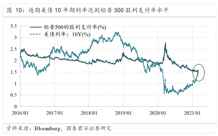 短期看,当前10年期美债的收益率出现一波快速上升,从1.1%水平升至1.56%,达到美国标普500指数的股利支付率水平。伴随着美国经济复苏,上市公司的财务将继续好转,预计美股股利将有所上升,因此对于美债利率上升的约束力将有所减弱。从历史来看,当美债收益率冲破股利支付率后,仍将有一段时间的继续升高。不可否认的是,以获取股利为投资逻辑的部分低风险偏好资金可能会开始考虑增配美债。从历史经验来看,未来美债利率的上升速度或将有所减缓。