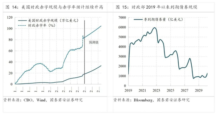 第三,美国财政部的发债期限不断拉长。从发债期限看,财政部的中长期国债(Notes,期限2-10年)规模加权平均期限从5.2年升至5.4年;长期国债(Bonds,期限20年或30年)的发行量从500亿美元/季度升至1700亿美元/季度。