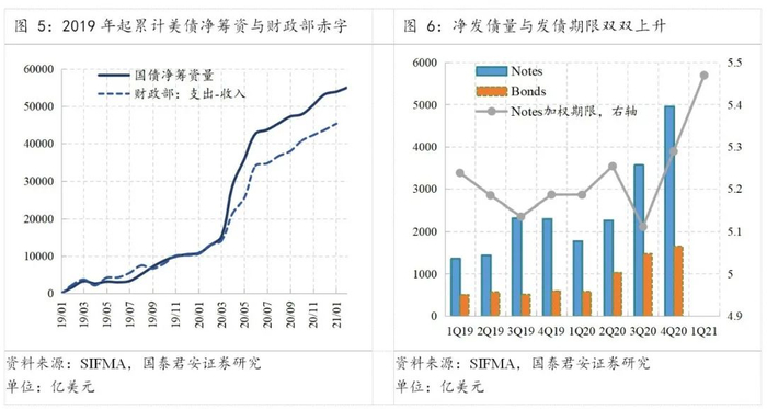 首先,新冠疫情后的美国财政部净融资步伐加速。2019年,美财政部平均月净融资在1000亿美元左右;剔除2020年2季度的天量发行,2020年6月后美财政部仍然保持平均每月1500亿的净融资规模,较2019年提高了500亿美元/月,这几乎相当于2014-2017年美财政部全年的净融资量。