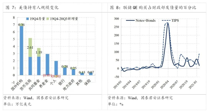 第一,购买机构在疫情前后发生重大变化,联储和共同基金成为主要购买人。静态看,美债的需求方包含以下几类:国外机构、养老金、共同基金、美联储等。本次疫情前,美债存量共计19.43万亿美元,按类型统计的持有人占比分别为:国外机构(35.1%)、养老金(15.1%)、共同基金(13.3%)、联储(13.1%)、个人(10.1%)、银行(5.4%)、地方政府(4.3%)和保险机构(1.9%)。新冠疫情以来,由于联储无限量QE政策和国际局势变化,增量资金占比出现较大改变。其中,联储新增购买美债规模2.61万亿美元,共同基金新增购入1.19万亿美元,这两类机构是近期的主要购买人。海外机构、银行、地方政府等也分别增加2000-4000亿美元的国债配置。受低利率环境和目标收益率要求的影响,美国养老金机构和个人甚至略微减少了美债配置规模。