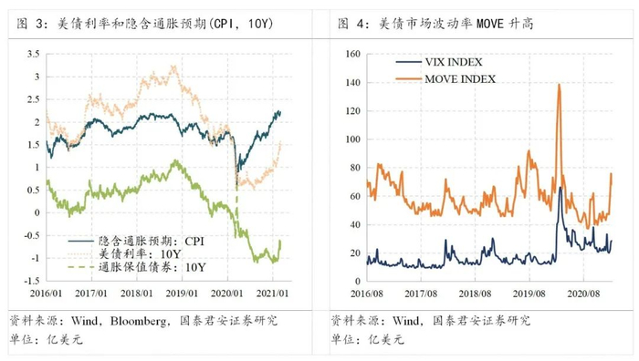 观察美债市场波动率指标(MOVE),两轮隐含通胀预期快速升高,都伴随着美债波动性的降低,反映了市场对未来经济表现的确定性增强。反观2月份以来美债市场波动率大幅提高,似乎与以往“经济确定性提高→通胀预期上升→波动率下降”的故事不同。