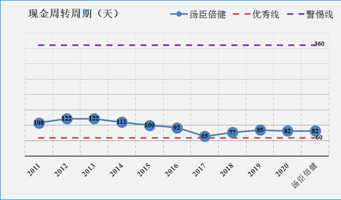 现金循环周期又可称为净营业周期,是考量企业日常运营环节的现金流状况,优先关注那些该指标小于60的企业,负数更为优,表示企业的还款周期远大于存货变现期。警惕该指标大于360的企业。