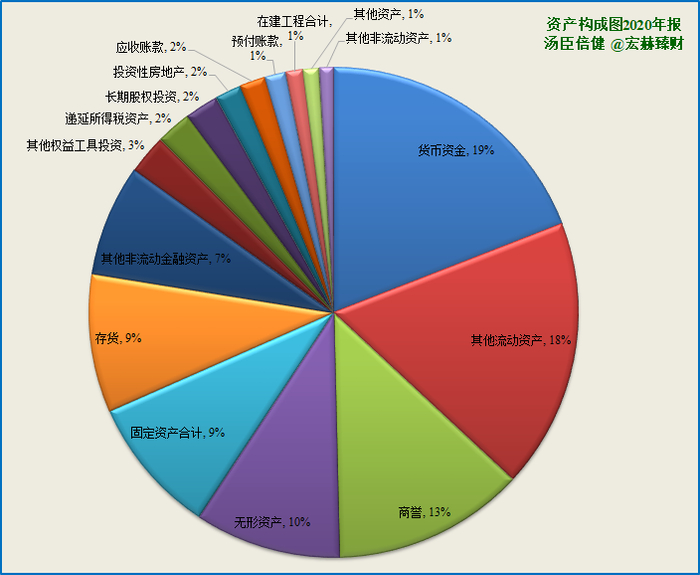 第二大资产为其他流动资产17.1亿,占比17.7%;2019末占比3.7%。