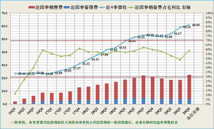 投资者可关注近四季销售和管理费用与毛利润之比持续小于30%的公司(绿线低于下红线为优异,靠近为优秀),具备较高的竞争优势,若30-70%之间为可接受区域(图中红色直线之间),若大于70%需要警惕,说明该公司产生净利润的能力较弱。