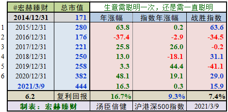 期初至今6.2年的光阴里市值从171亿增长至444亿,实现年均复利回报率16.7%,同期指数年均增长9.3%。