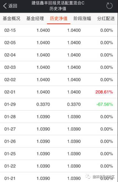 2016年1月29日,建信基金旗下建信鑫丰回报C类份额1月29日的份额净值为0.337元,而在前一开放日该基金的单位净值为1.039元。也就是说,仅仅一天时间,该基金份额跌幅高达67.56%之多。