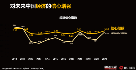 中国高净值人群对未来中国经济的信心增强:高净值人群经济信心指数达6.51分(满分10分),高于前两年,并且是这十年来除2018年以外的最高分。表示“非常有信心”的比例增长至47%,是十年来最高。